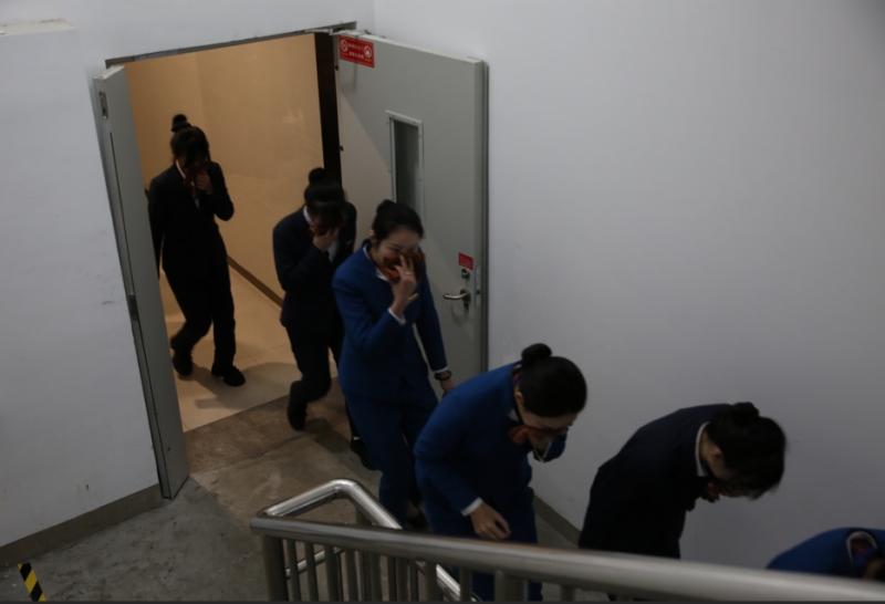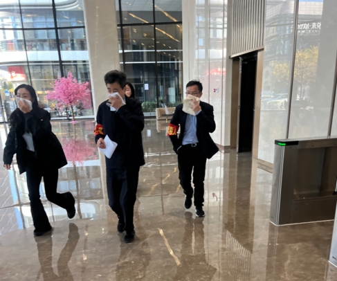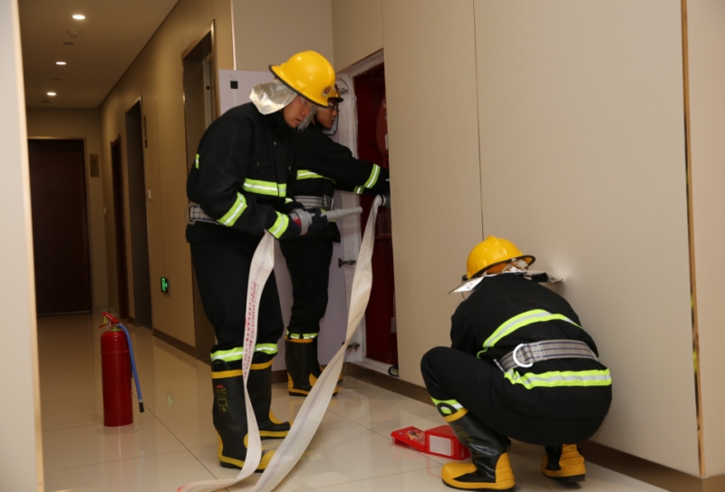 本次演练以2520会议室为模拟着火点,中控室收到烟感报警后,工作人员迅速确认火情,现场指挥立即启动应急预案。灭火组快速穿戴消防服赶赴火场,利用灭火器、消防水带扑救初期火灾;设备组同步将全部电梯迫降至1楼,保障疏散安全;疏散组按照“向下疏散、应下尽下”原则,引导人员用湿毛巾捂住口鼻,沿指定楼梯有序撤离,身体不适人员按楼层就近疏散至避难层;警戒组、救护组分别做好现场警戒与应急救护准备。