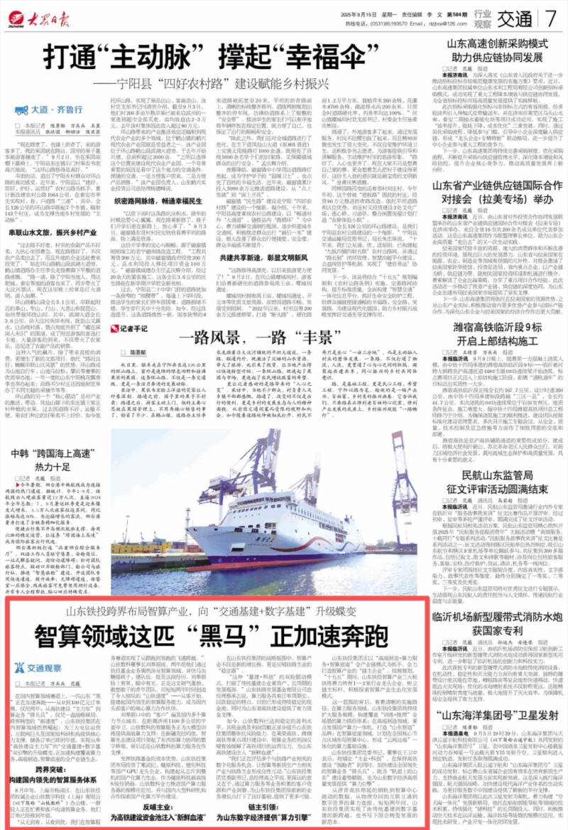 9月15日,《大众日报》7版交通版刊发《威廉希尔体育跨界布局智算产业,向“交通基建+数字基建”升级蝶变——智算领域这匹“黑马”正加速奔跑》,专题报道威廉希尔体育集团智算业务发展情况。以下是《大众日报》原文。