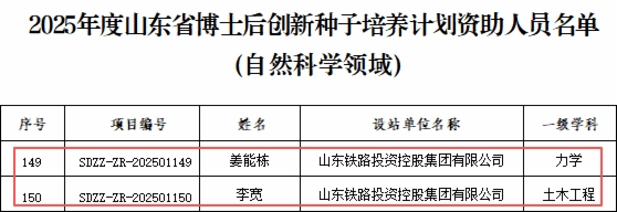 近日,山东省人力资源和社会保障厅公布2025年度山东省博士后创新种子培养计划入选名单,威廉希尔体育集团博士后姜能栋、李宽成功入选,这是集团在高层次创新人才培养方面取得的又一重要突破。