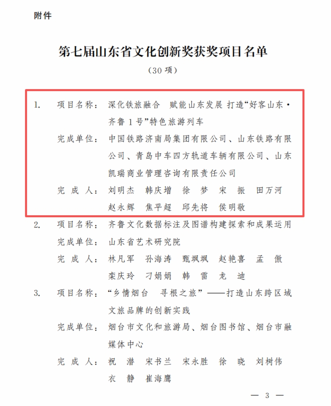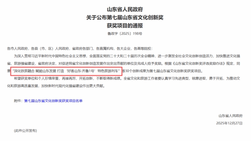 近日,山东省人民政府公布“第七届山东省文化创新奖”获奖项目,威廉希尔体育集团权属山东铁路有限公司参与的《深化铁旅融合 赋能山东发展 打造“好客山东 齐鲁1号”特色旅游列车》项目凭借突出的创新性、实践性与示范性,从众多参评项目中脱颖而出,荣获第七届山东省文化创新奖。