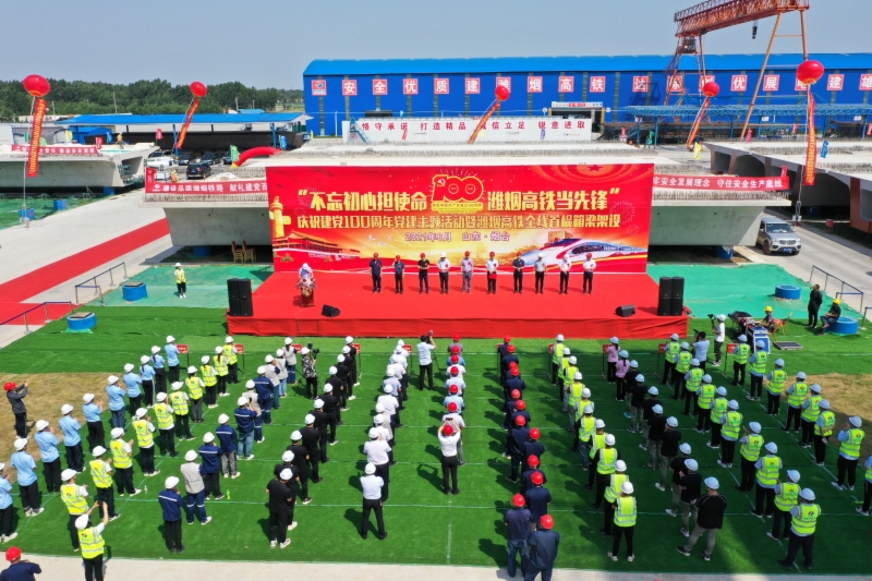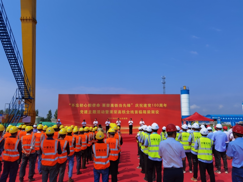 6月26日,山东重点铁路工程项目潍烟高铁、莱荣高铁在烟台和威海两地同时举行庆祝建党100周年党建主题活动暨首榀箱梁架设活动。