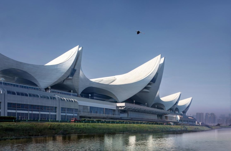 红岛站设计寓意“观海听涛”,立意于青岛自然滨海特色,以海浪、贝壳、山峦为意向,站房主立面五朵标志性浪花与“海浪”遥相呼应。