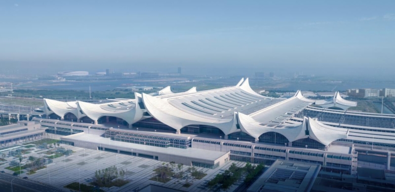 济青高铁红岛站位于青岛市城阳区,是济青高铁设计终点站,站房面积7万平方米,采用线上式布置,由下至上分别为出站层、广场层、站台层、高架候车层及旅服夹层,建筑总高度52.993m。红岛站站场设计规模10台20线,是山东省第二大,青岛市最大的高铁站。