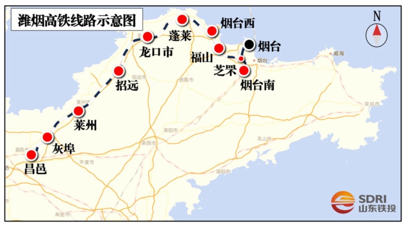 由潍烟高铁公司投资建设、中铁一局承揽全线铺轨施工任务潍烟高铁,于2020年12月正式开工建设,正线全长237.3公里,其中正线路基70.344公里,桥梁87座158.53公里,双线隧道8座8.44公里。线路由潍莱高铁昌邑站引出,经潍坊昌邑市,青岛平度市,烟台莱州市、招远市、龙口市、蓬莱区、烟台经济技术开发区、福山区、芝罘区,接入青烟直通线芝罘站。全线设昌邑站(既有)、灰埠站(原设计平度新河站)、莱州站、招远站、龙口市站(既有)、蓬莱市站(既有)、烟台西站(原设计大季家站)、福山南站、芝罘站(既有)等9座车站,并通过刘家线路所、蓁山线路所连通烟台南站和烟台站,线路设计时速350公里。