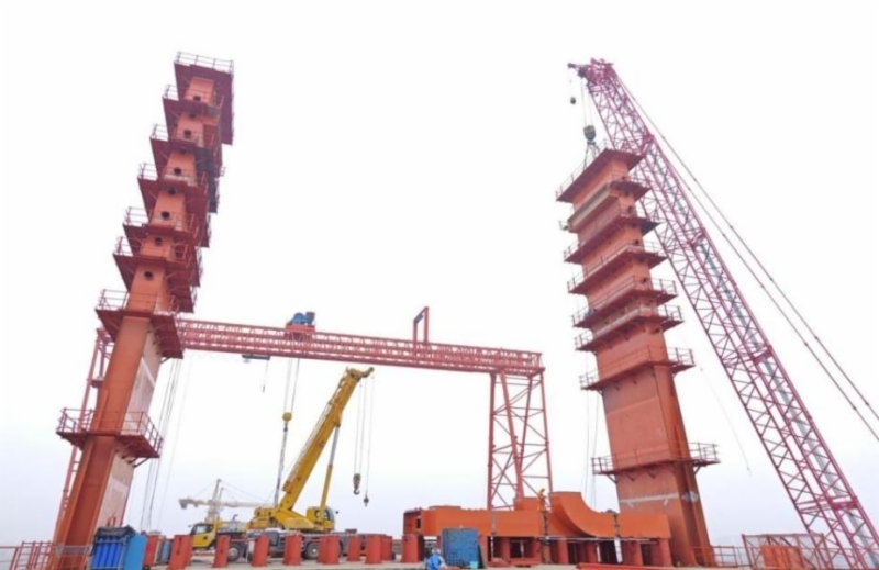 济阳黄河公铁两用特大桥作为济滨高铁的控制性工程之一,主桥桥跨布置为(84+144+228+240+300+120+60)m,全桥长1178m,是世界首座非对称、多塔、不等跨矮钢塔钢桁梁公铁两用斜拉桥。其中大桥主塔高度受遥墙机场飞机爬升控制面限高控制,P37号-P40号墩塔高分别为28.5m、31m、33m、36.5m。此次封顶的P40号墩主塔,共10个节段,前7节段采用门吊吊装,后3个节段采用400吨履带吊吊装施工。