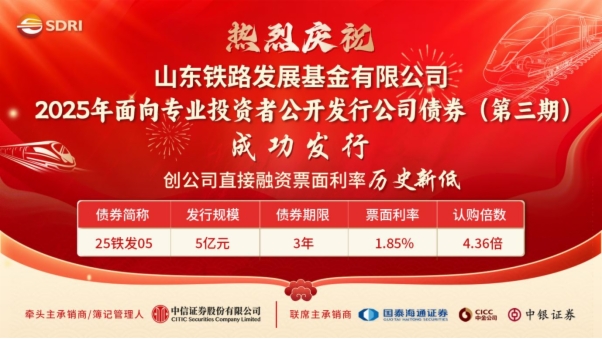 近日,威廉希尔体育集团权属山东铁路发展基金有限公司(以下简称基金公司)成功发行5亿元公司债券,3年期票面利率低至1.85%,认购倍数达4.36倍,创公司直接融资票面利率历史新低。本期债券成功发行,有利于降低铁路发展基金整体融资成本,持续赋能未来业务发展。